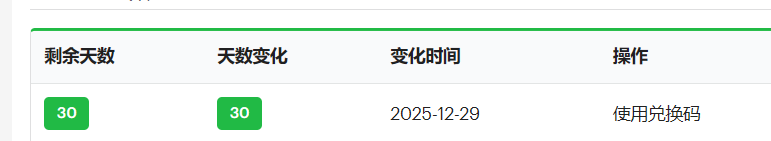 | 兑换码 | 可兑换天数 | 状态 |